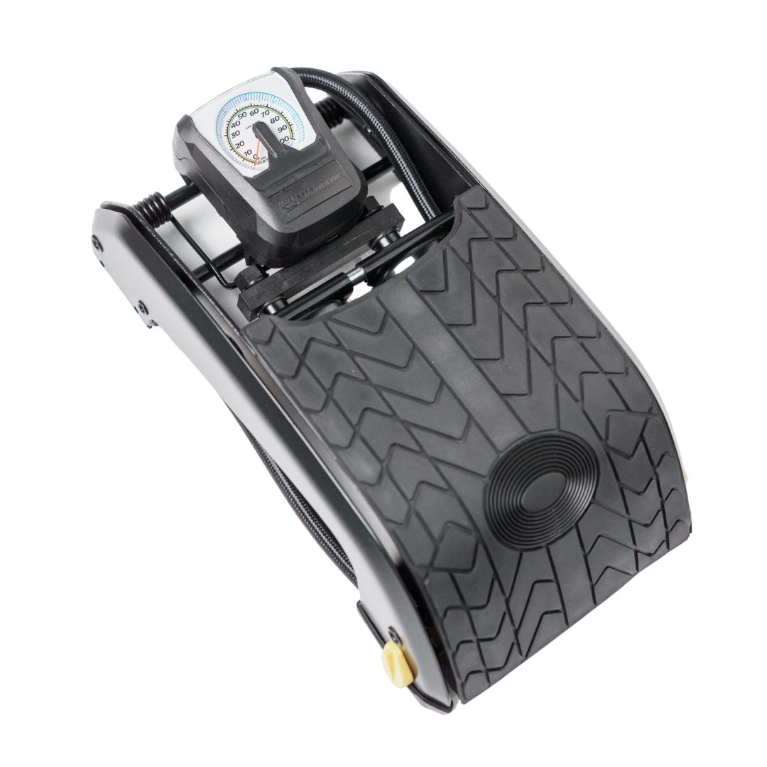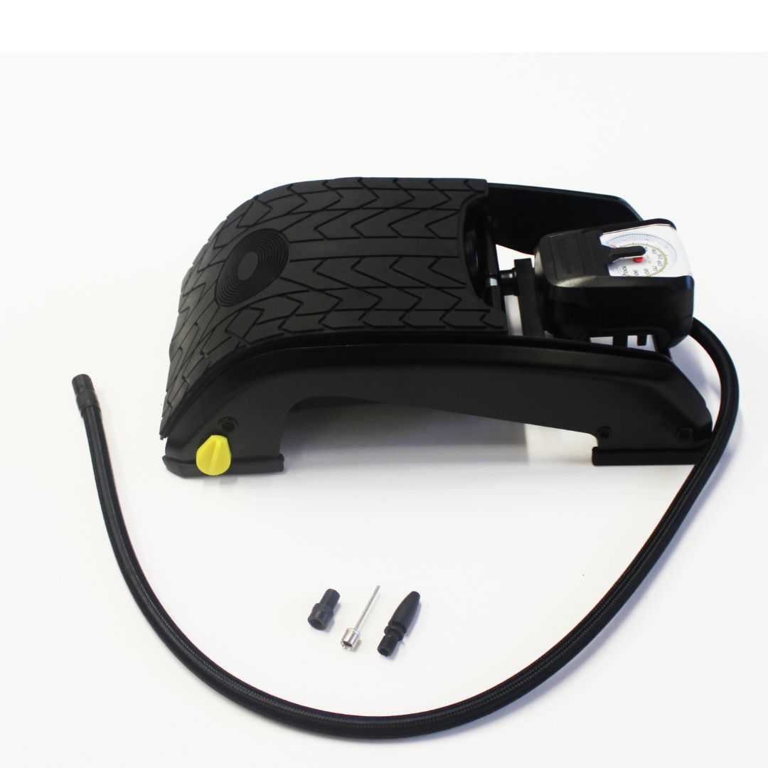Features: Analogue gauge accurate to +/- 1 PSI up to 50 PSI Twin barrel design for high volume inflation Dual display for PSI & BAR Moulded gauge with snap-in adaptor storage. Sturdy wide footprint steel frame with rubber feet to aid grip and stability Ergonomic rubber tread plate.